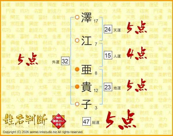 澤(17画)江(7画) 亜(8画)貴(12画)子(3画)