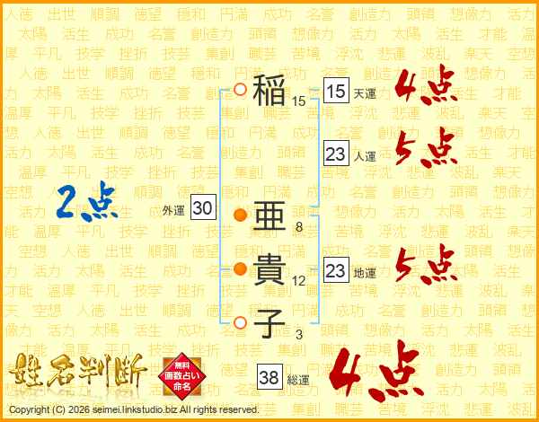 稲(15画) 亜(8画)貴(12画)子(3画)