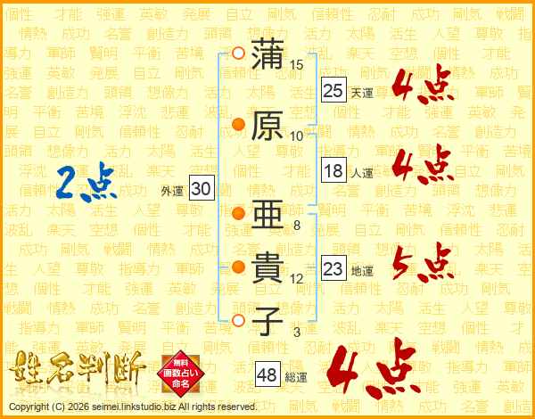 蒲(15画)原(10画) 亜(8画)貴(12画)子(3画)