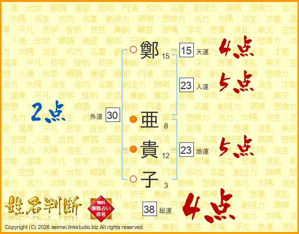 鄭亜貴子さんの総運は38画の4点!