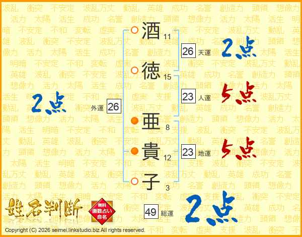 酒(11画)徳(15画) 亜(8画)貴(12画)子(3画)