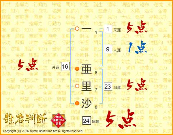 生活面を象徴する運勢です。外部から受ける影響力を表し、結婚運、家庭運や職場、環境への順応性を表します。総運から人運を引いた画数。姓や名が1文字の場合を除く。