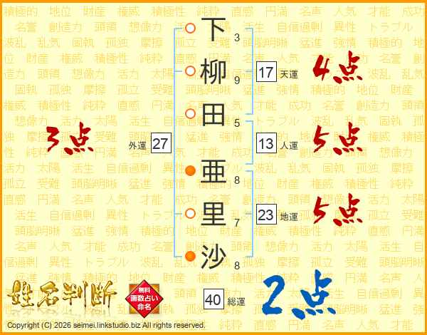 下(3画)柳(9画)田(5画) 亜(8画)里(7画)沙(8画)