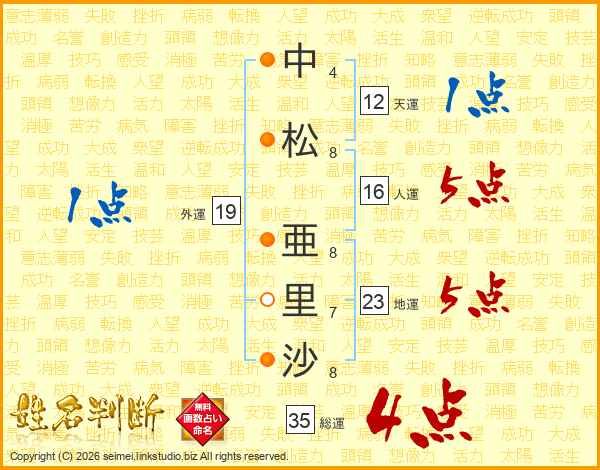 中(4画)松(8画) 亜(8画)里(7画)沙(8画)