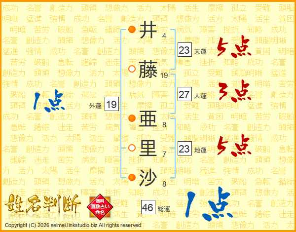 井(4画)藤(19画) 亜(8画)里(7画)沙(8画)