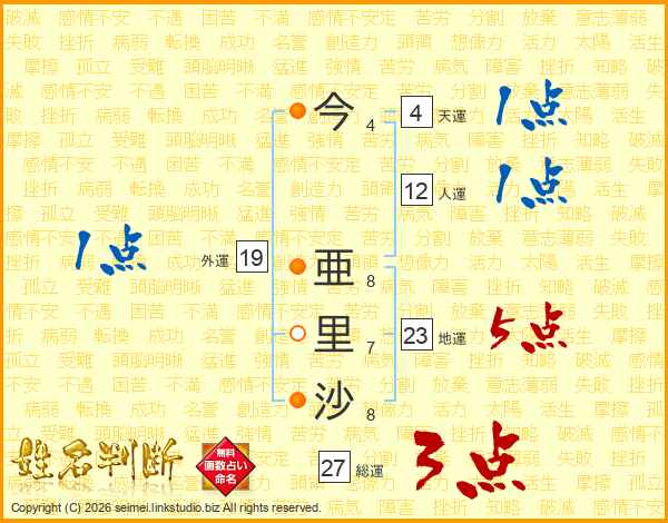 今(4画) 亜(8画)里(7画)沙(8画)