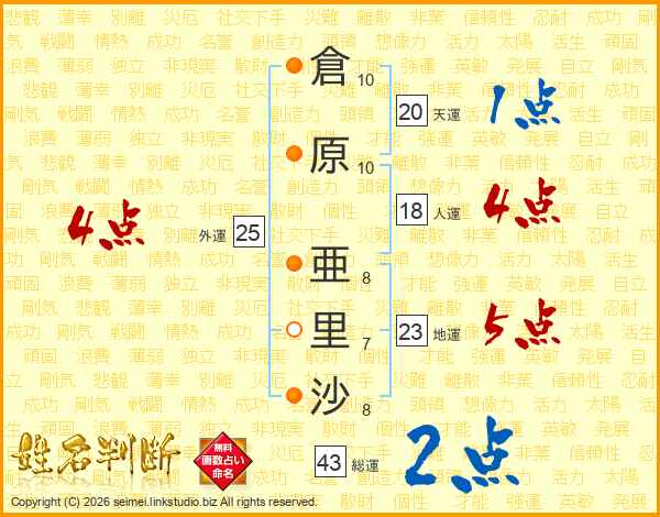 倉(10画)原(10画) 亜(8画)里(7画)沙(8画)