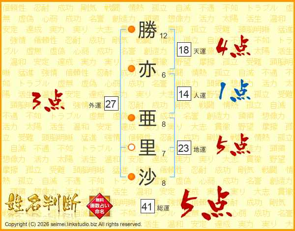 勝(12画)亦(6画) 亜(8画)里(7画)沙(8画)