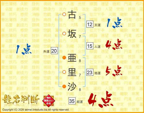 古(5画)坂(7画) 亜(8画)里(7画)沙(8画)