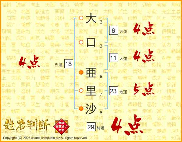 大(3画)口(3画) 亜(8画)里(7画)沙(8画)
