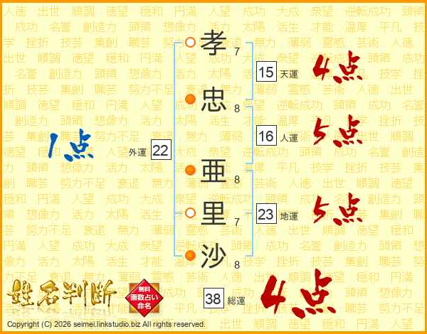 孝(7画)忠(8画) 亜(8画)里(7画)沙(8画)