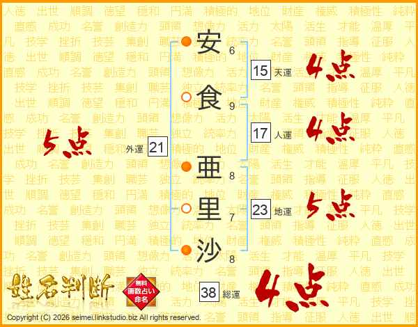 安(6画)食(9画) 亜(8画)里(7画)沙(8画)