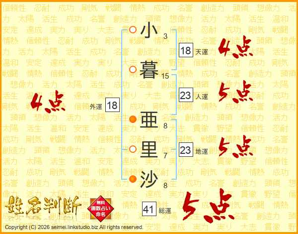 小(3画)暮(15画) 亜(8画)里(7画)沙(8画)