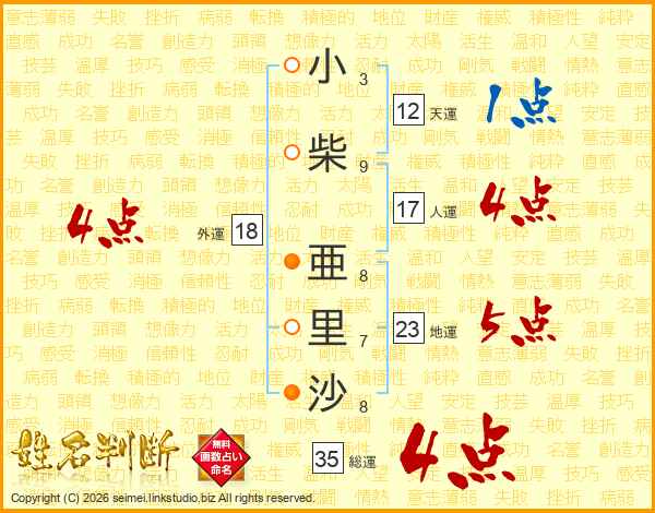 小柴亜里沙さんの総運は35画の4点!