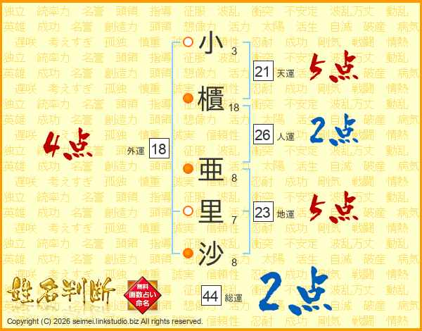 小櫃亜里沙さんの総運は44画の2点!