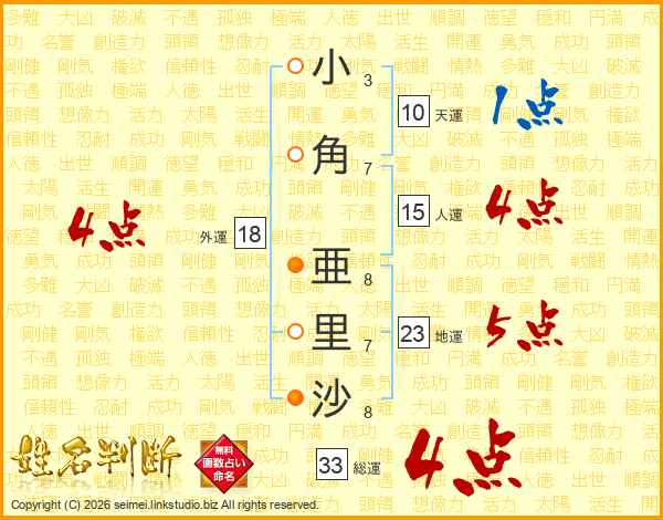 小(3画)角(7画) 亜(8画)里(7画)沙(8画)