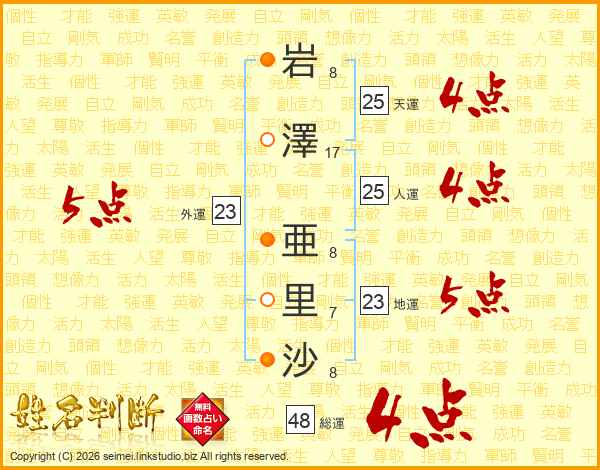 岩(8画)澤(17画) 亜(8画)里(7画)沙(8画)