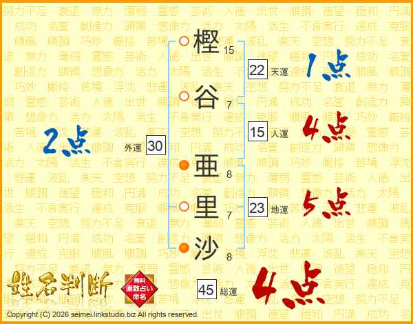 樫(15画)谷(7画) 亜(8画)里(7画)沙(8画)
