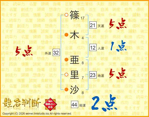 篠(17画)木(4画) 亜(8画)里(7画)沙(8画)