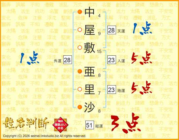 中(4画)屋(9画)敷(15画) 亜(8画)里(7画)沙(8画)