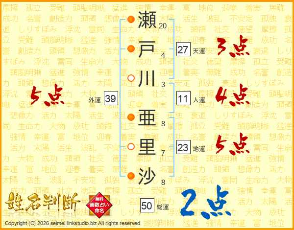 瀬戸川亜里沙さんの外運は39画の5点!