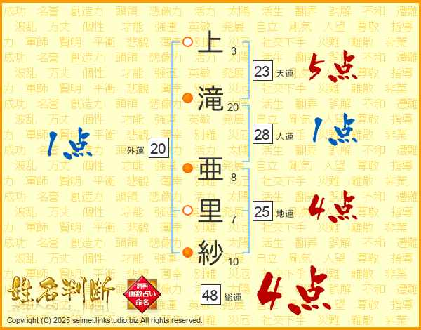上(3画)滝(20画) 亜(8画)里(7画)紗(10画)