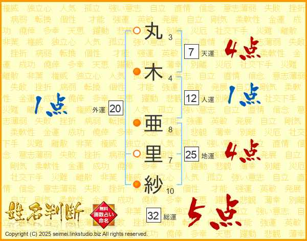丸(3画)木(4画) 亜(8画)里(7画)紗(10画)