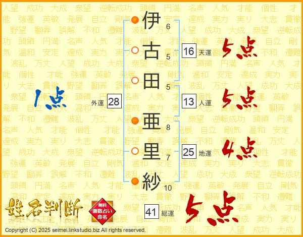 伊(6画)古(5画)田(5画) 亜(8画)里(7画)紗(10画)