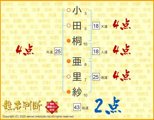小(3画)田(5画)桐(10画) 亜(8画)里(7画)紗(10画)