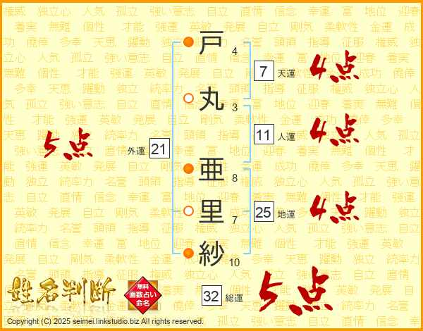 戸(4画)丸(3画) 亜(8画)里(7画)紗(10画)