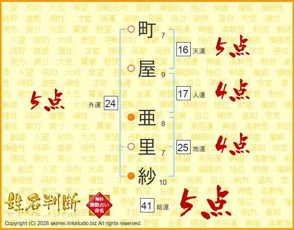 町(7画)屋(9画) 亜(8画)里(7画)紗(10画)