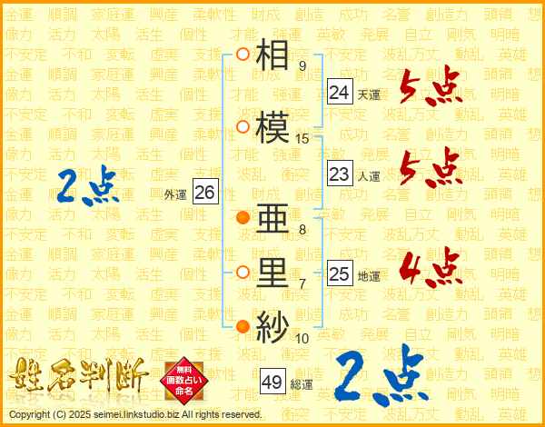 相(9画)模(15画) 亜(8画)里(7画)紗(10画)