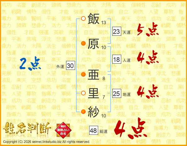 飯(13画)原(10画) 亜(8画)里(7画)紗(10画)