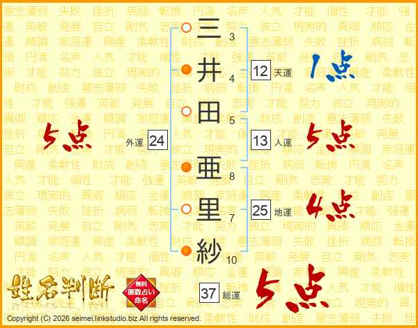 三井田亜里紗さんの総運は37画の5点!