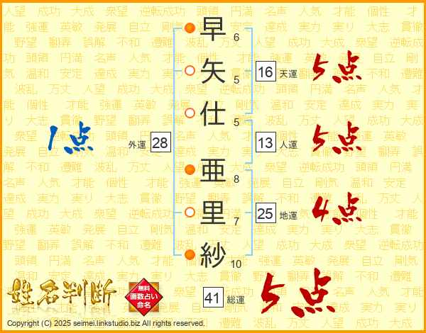 早(6画)矢(5画)仕(5画) 亜(8画)里(7画)紗(10画)