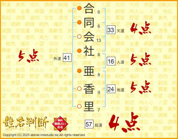 合同会社亜香里さんの天運は33画の4点!