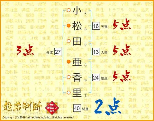小(3画)松(8画)田(5画) 亜(8画)香(9画)里(7画)