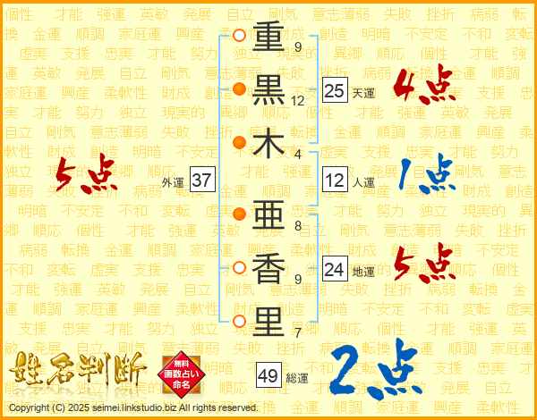 重黒木亜香里さんの総運は49画の2点!