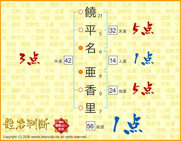 饒(21画)平(5画)名(6画) 亜(8画)香(9画)里(7画)