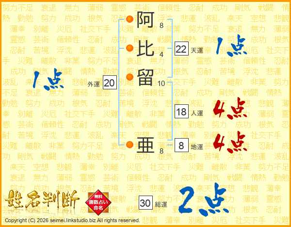 生活面を象徴する運勢です。外部から受ける影響力を表し、結婚運、家庭運や職場、環境への順応性を表します。総運から人運を引いた画数。姓や名が1文字の場合を除く。