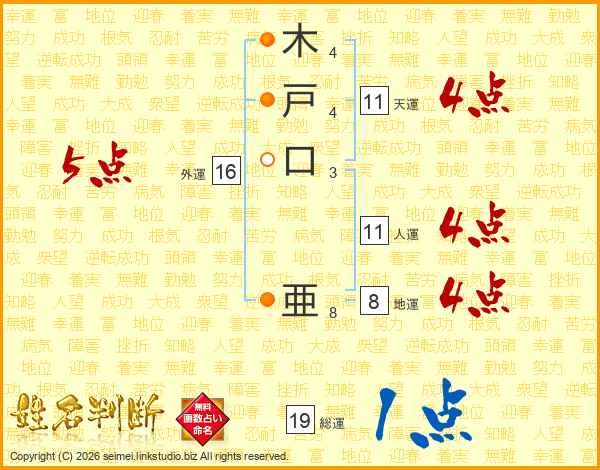 生活面を象徴する運勢です。外部から受ける影響力を表し、結婚運、家庭運や職場、環境への順応性を表します。総運から人運を引いた画数。姓や名が1文字の場合を除く。