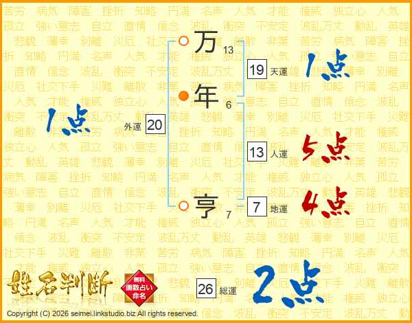 生活面を象徴する運勢です。外部から受ける影響力を表し、結婚運、家庭運や職場、環境への順応性を表します。総運から人運を引いた画数。姓や名が1文字の場合を除く。