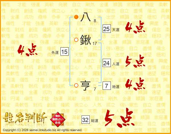 生活面を象徴する運勢です。外部から受ける影響力を表し、結婚運、家庭運や職場、環境への順応性を表します。総運から人運を引いた画数。姓や名が1文字の場合を除く。