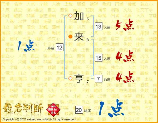 生活面を象徴する運勢です。外部から受ける影響力を表し、結婚運、家庭運や職場、環境への順応性を表します。総運から人運を引いた画数。姓や名が1文字の場合を除く。