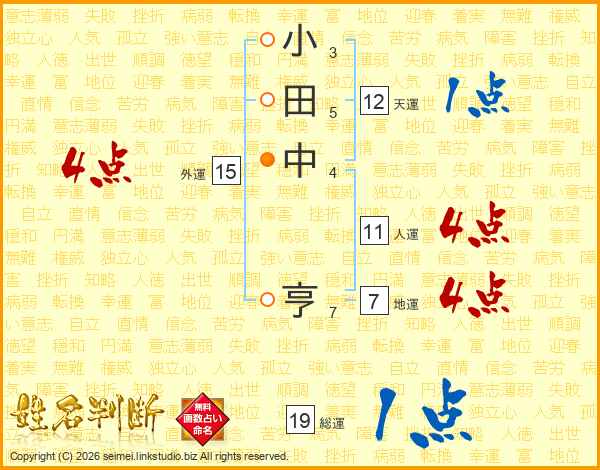 小(3画)田(5画)中(4画) 亨(7画)