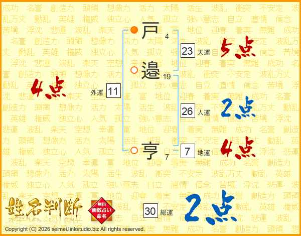 生活面を象徴する運勢です。外部から受ける影響力を表し、結婚運、家庭運や職場、環境への順応性を表します。総運から人運を引いた画数。姓や名が1文字の場合を除く。