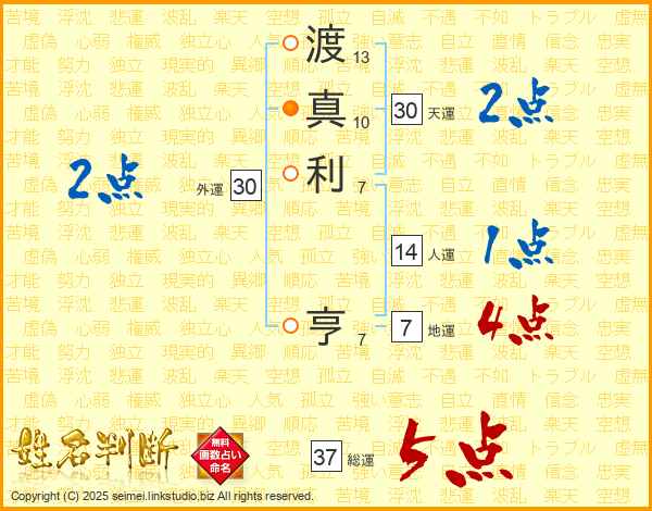 生活面を象徴する運勢です。外部から受ける影響力を表し、結婚運、家庭運や職場、環境への順応性を表します。総運から人運を引いた画数。姓や名が1文字の場合を除く。