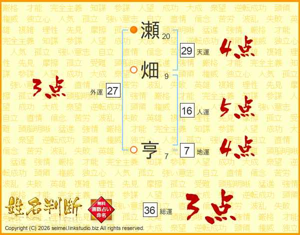 瀬畑亨さんの総運は36画の3点!