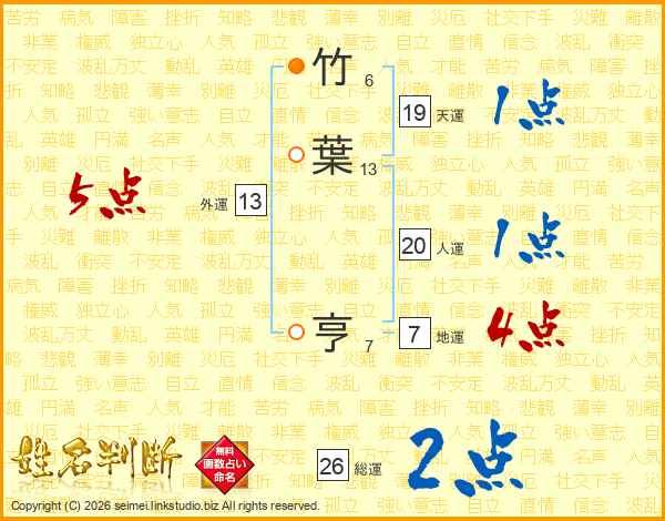 竹(6画)葉(13画) 亨(7画)