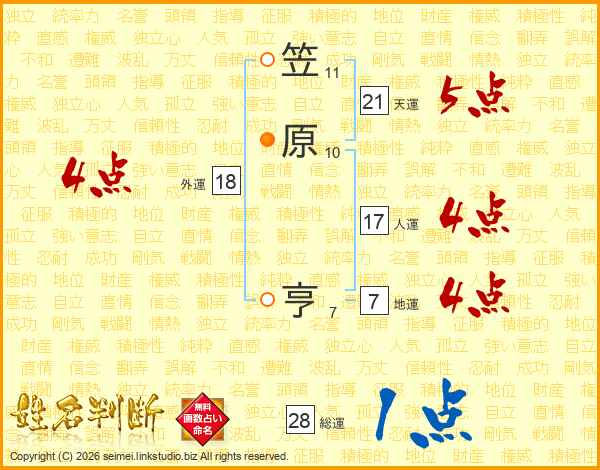 笠(11画)原(10画) 亨(7画)